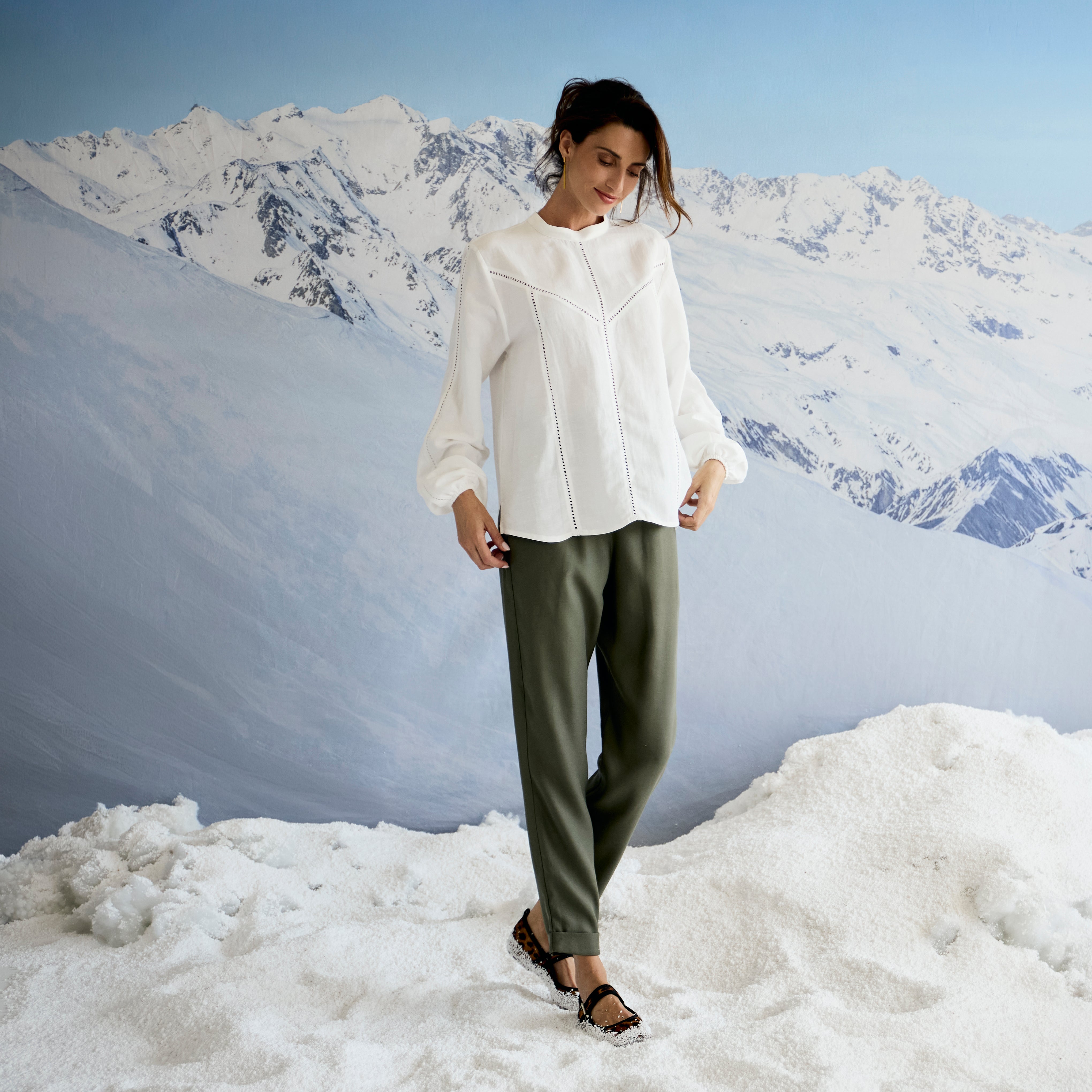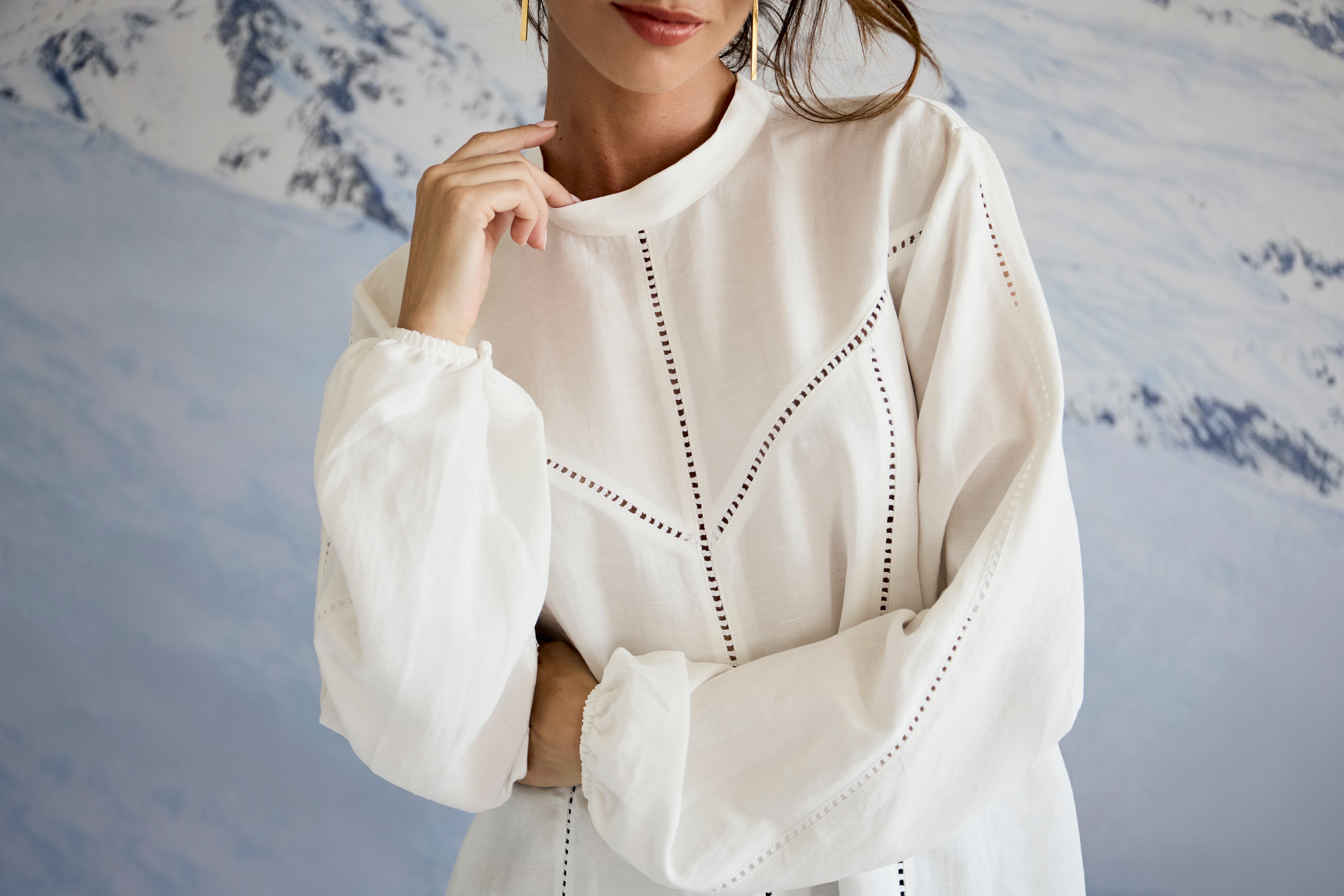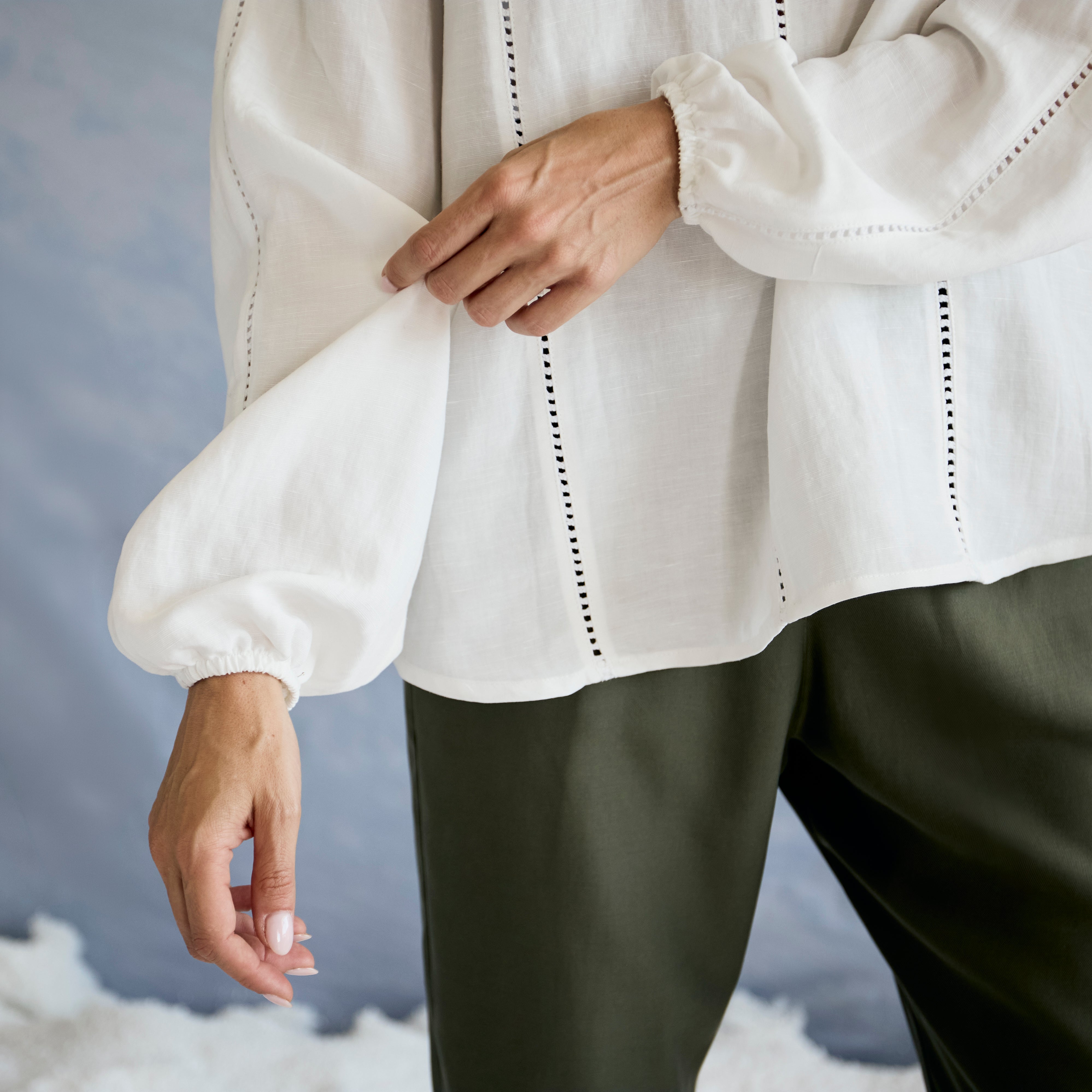 Soft detail, quiet confidence. This blouse keeps things easy with a round neckline that ties neatly at the back, while delicate pintucks and ladder lace trace gentle shape across the front. Long sleeves with softly elasticated cuffs bring a relaxed elegance, and a waterfall frill hem adds just the right amount of movement.