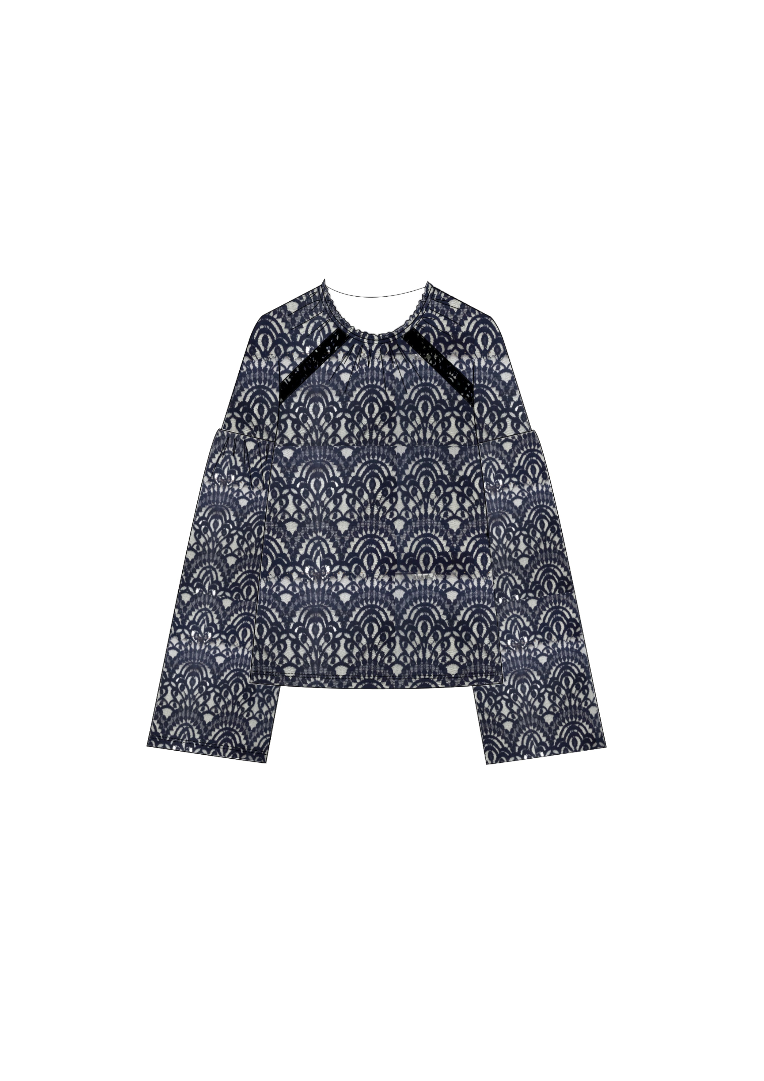 A romantic take on everyday lace. This raglan sleeve top features a soft frill neck finish, a cutline above the elbow with gentle gathers, and long bell sleeves that bring subtle drama to the silhouette. Lightweight, detailed, and beautifully airy, a new season lace moment.