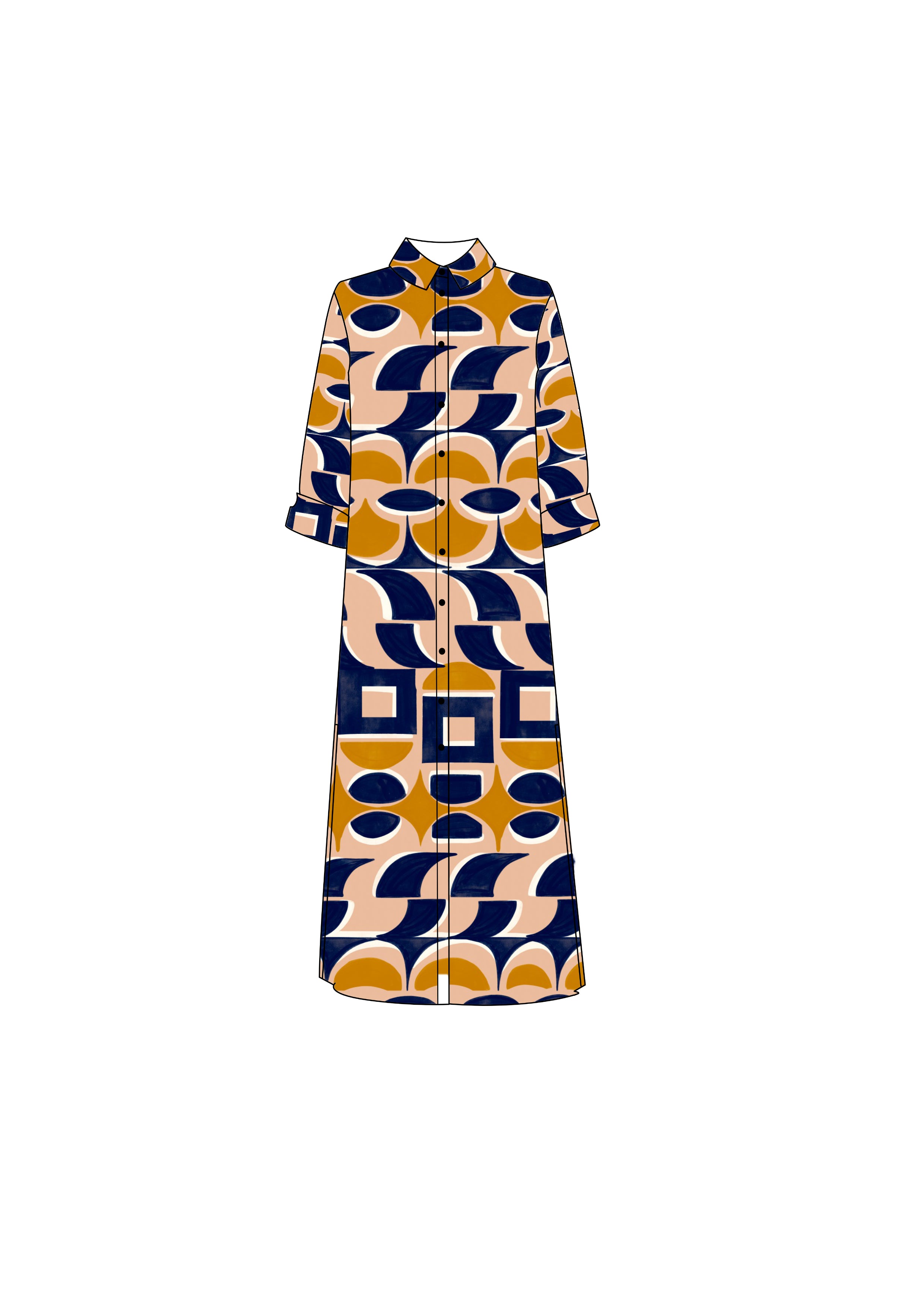 A mood boosting shirt dress with an easy swing and a graphic, retro edge. The relaxed button down silhouette keeps things effortlessly polished, while twin needle stitching adds that quiet, crafted finish. Rolled sleeves, a soft drape, and a just right midi length make it an everyday statement, equal parts playful and refined, designed to brighten the season in one smooth move.