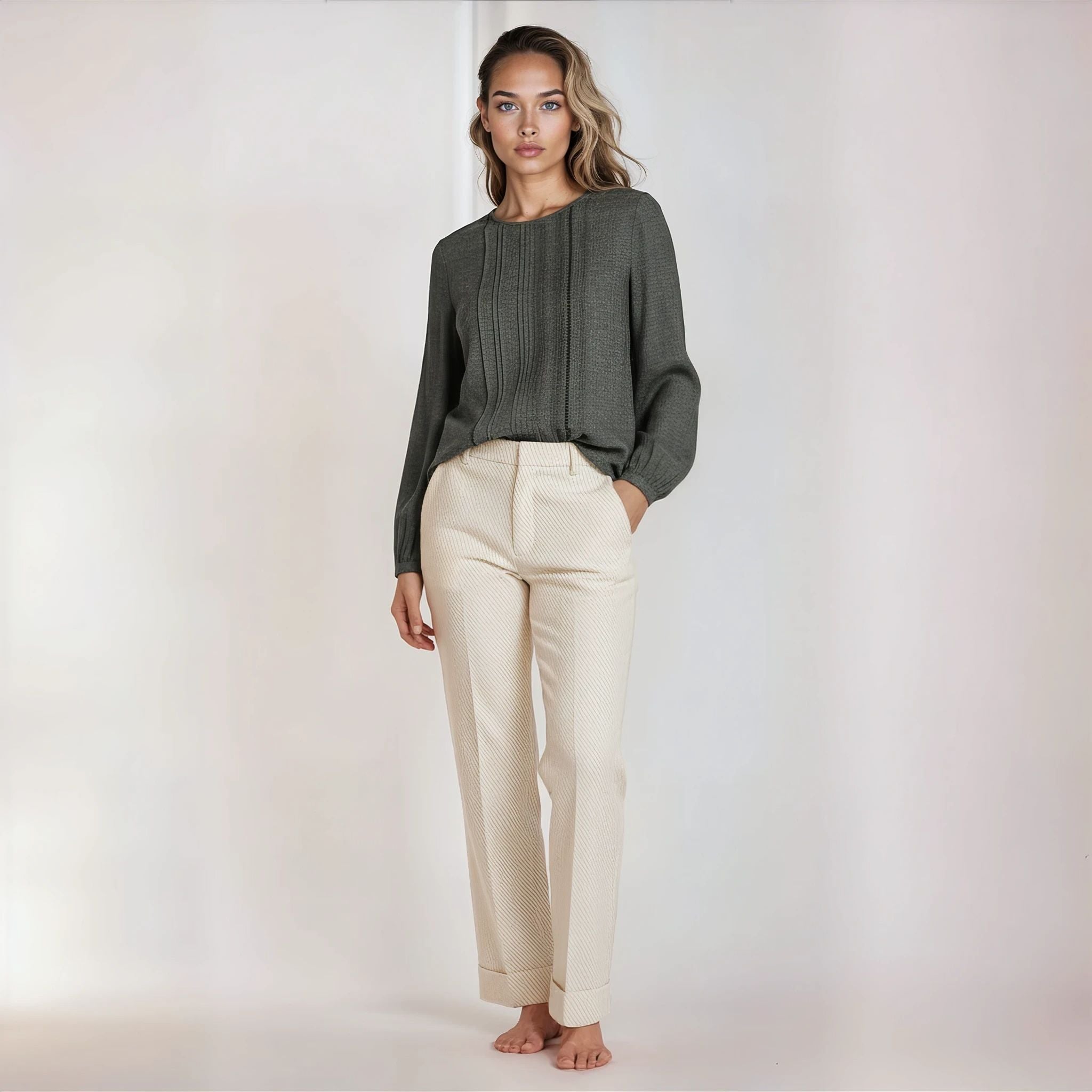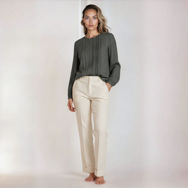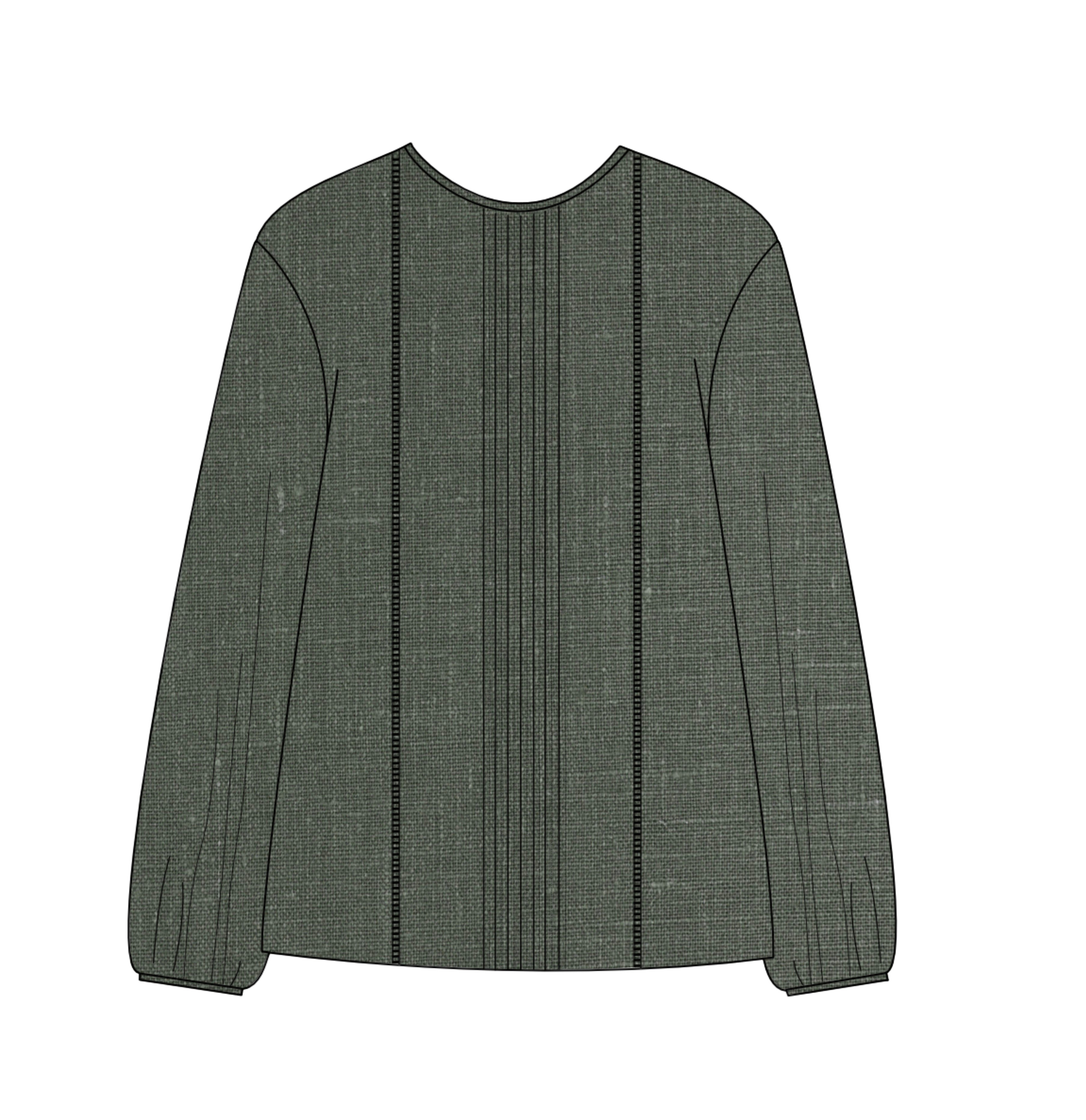 Pintucks and ladder lace trace the round neckline, while long sleeves finish in soft elasticated cuffs. A back neck keyhole adds ease, and a waterfall frill at the hem brings the perfect touch of floaty charm. A gentle classic with a little drama.