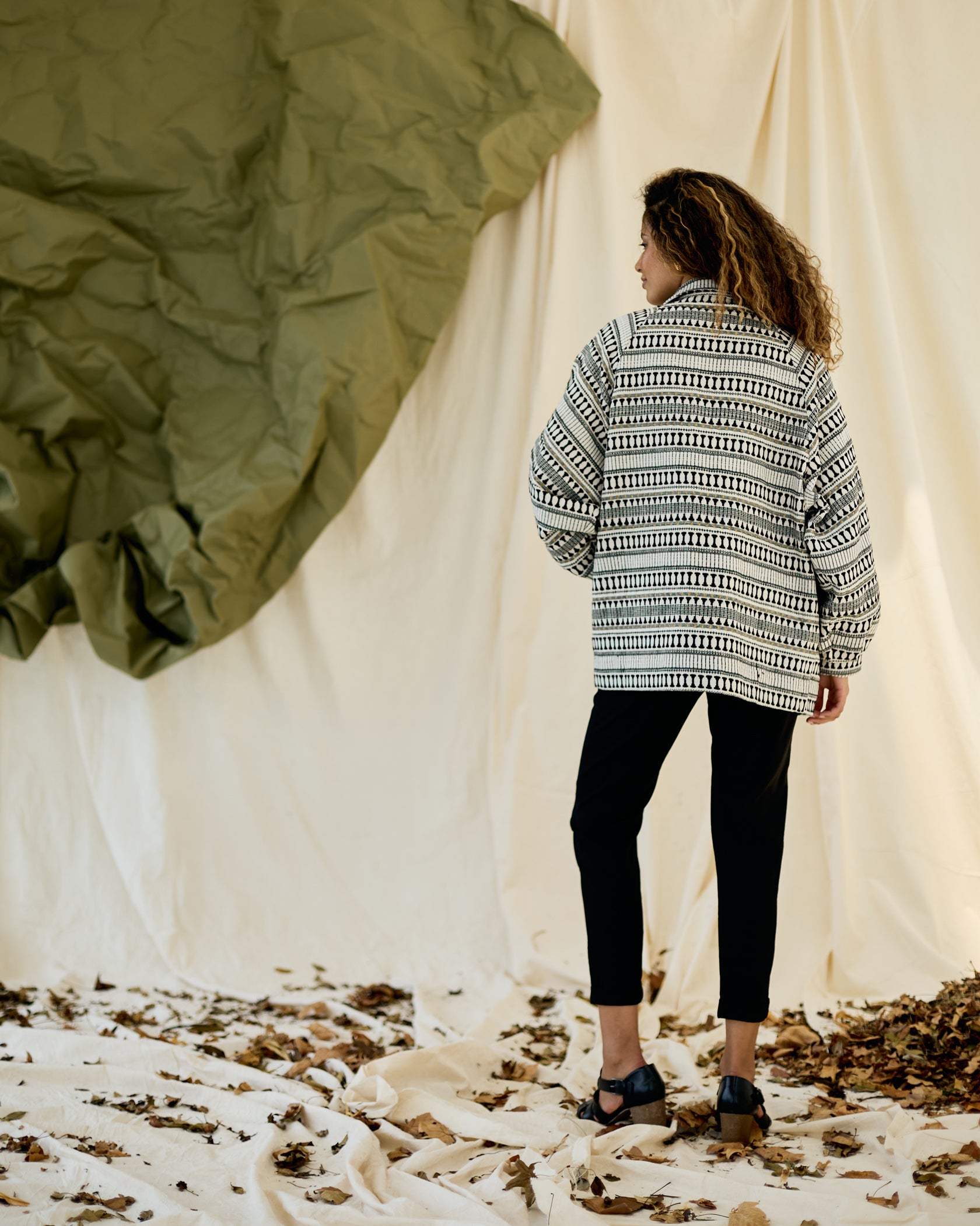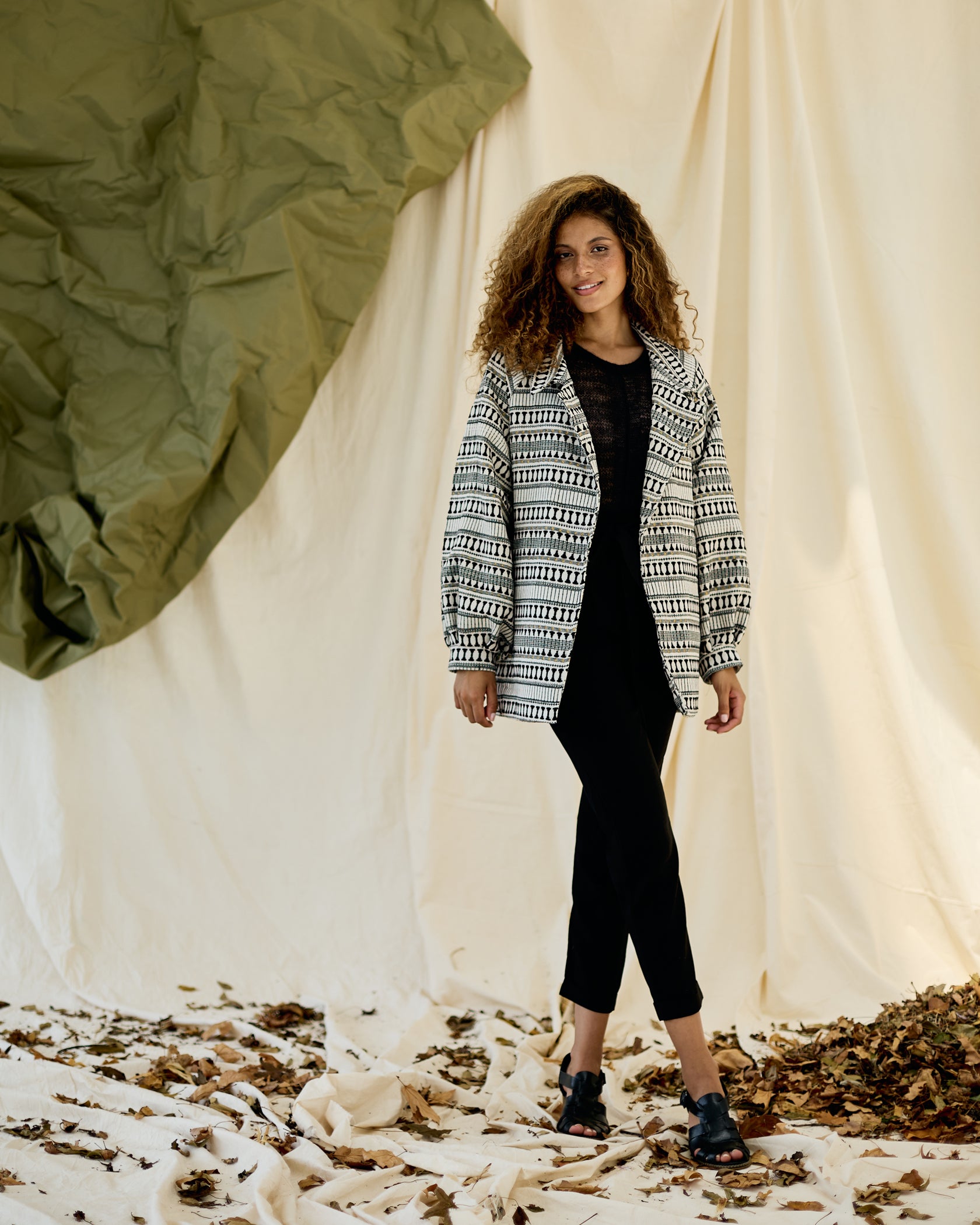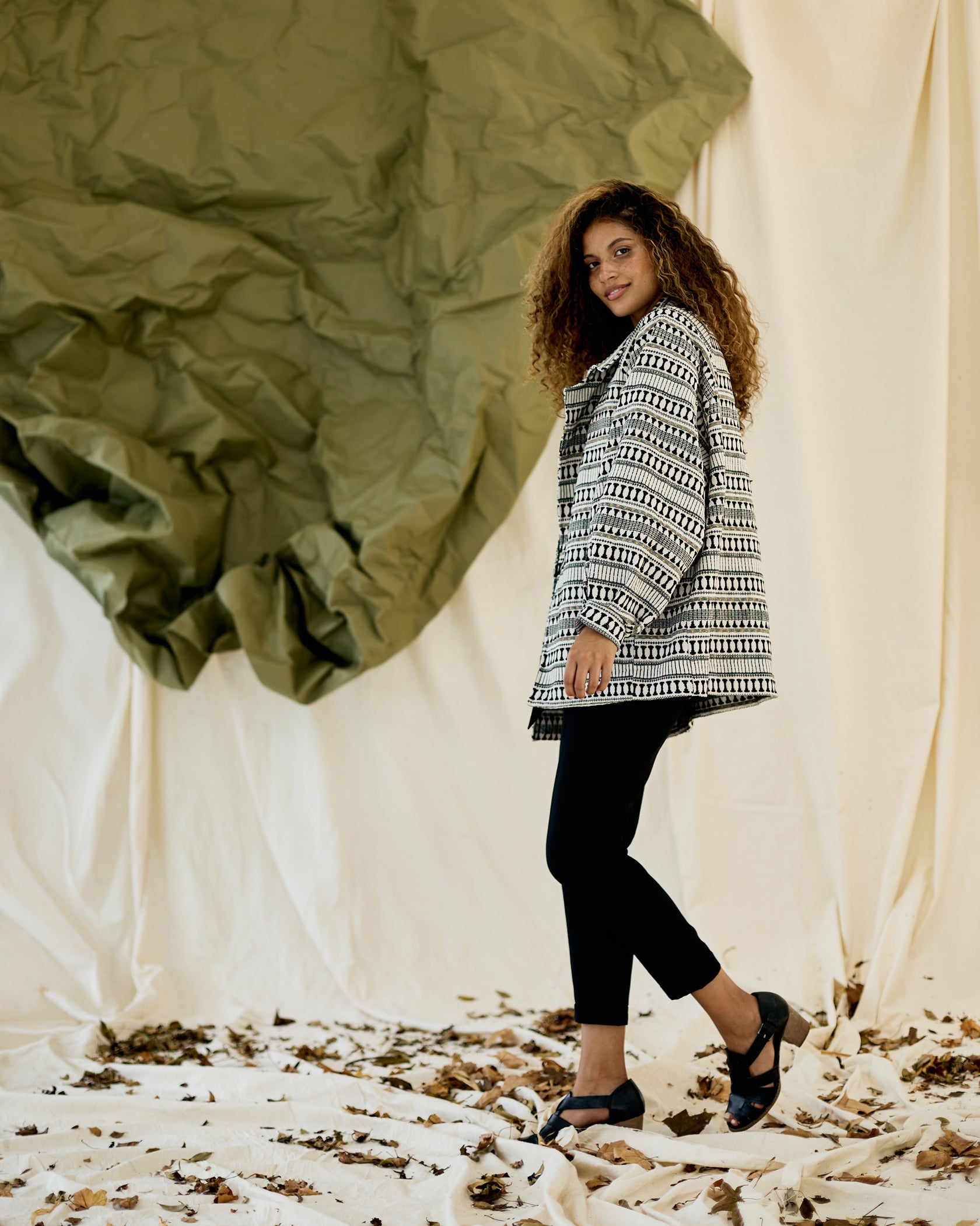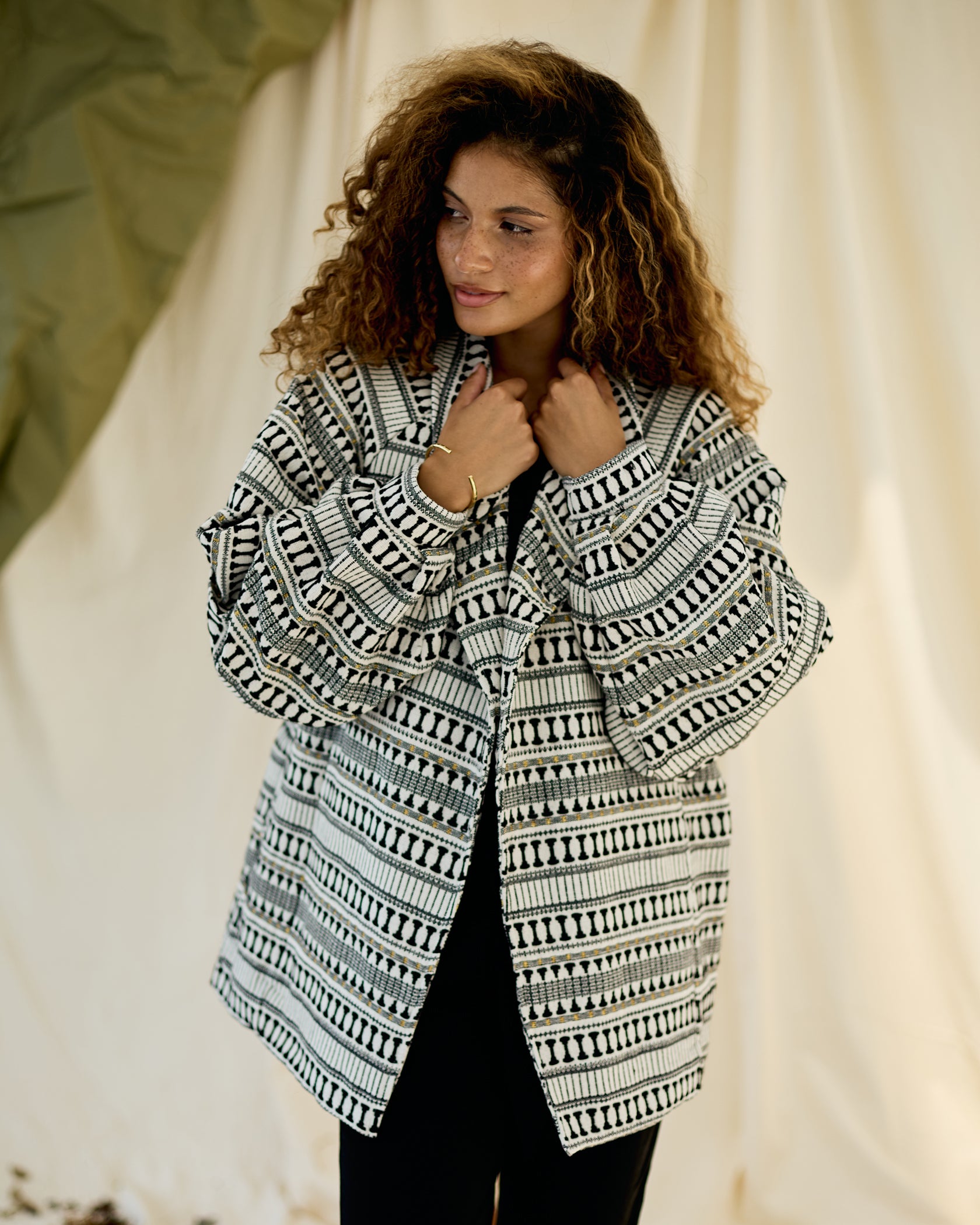 Please Note: This fabric is hand woven in India- there will be slight irregularities and organic slubs in the weave (see last picture) and the threads. As with any weave- there is a higher risk of snagging so please take extra care when wearing this jacket.