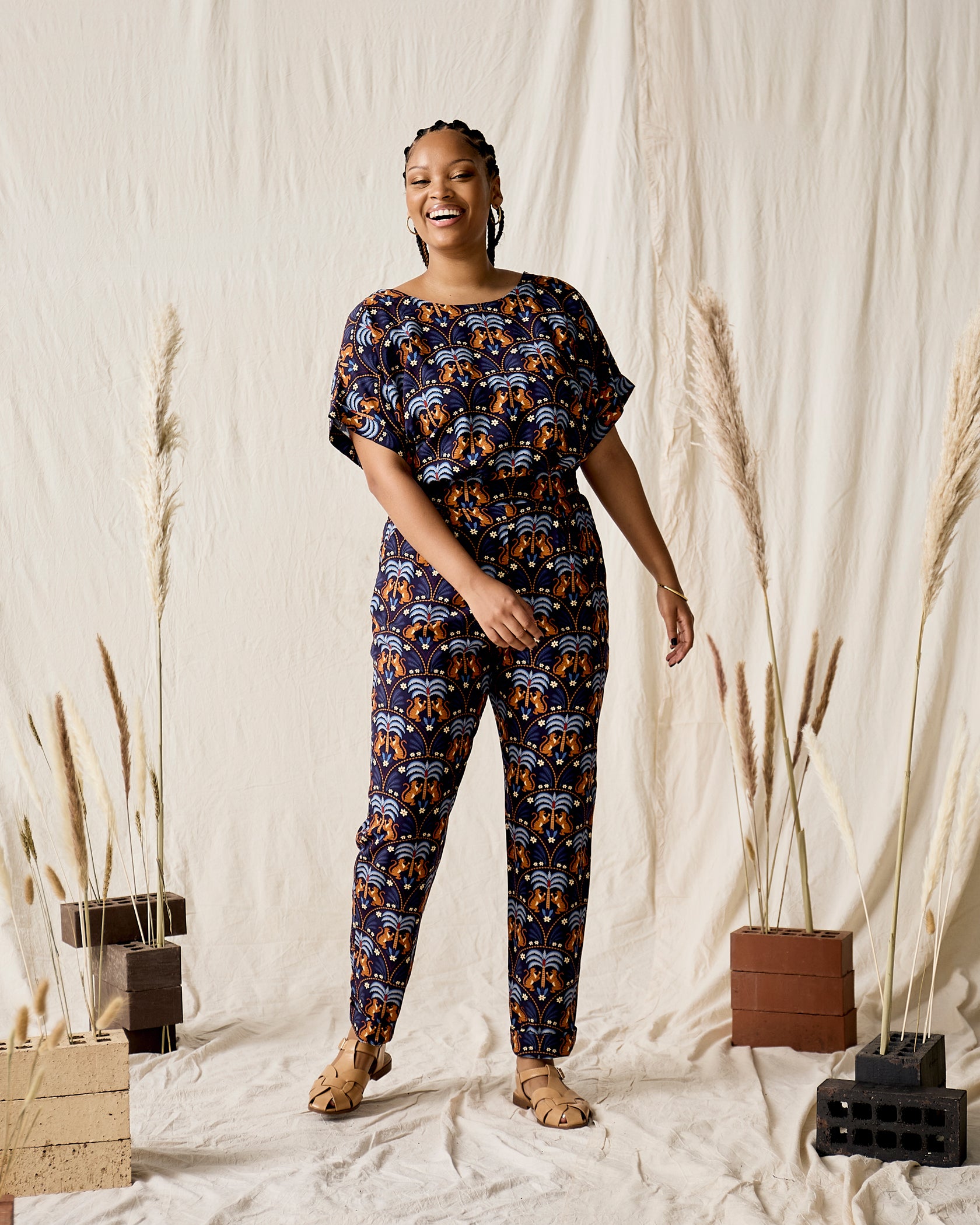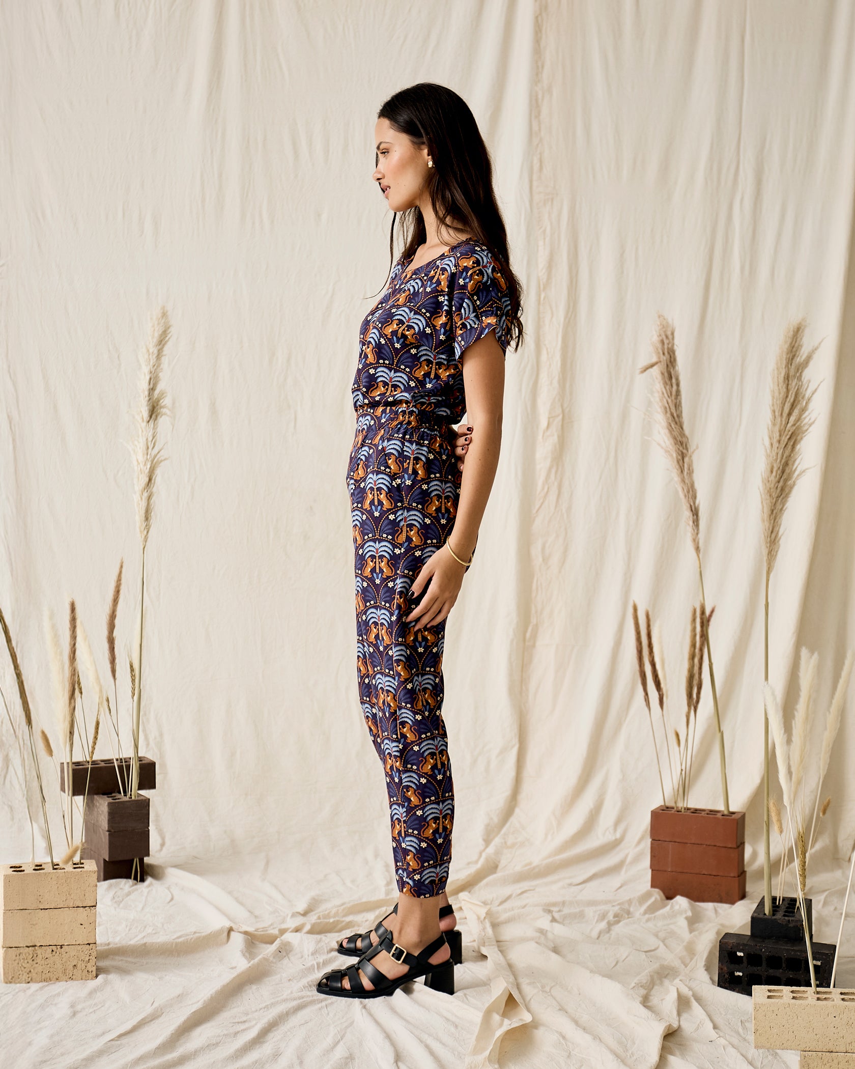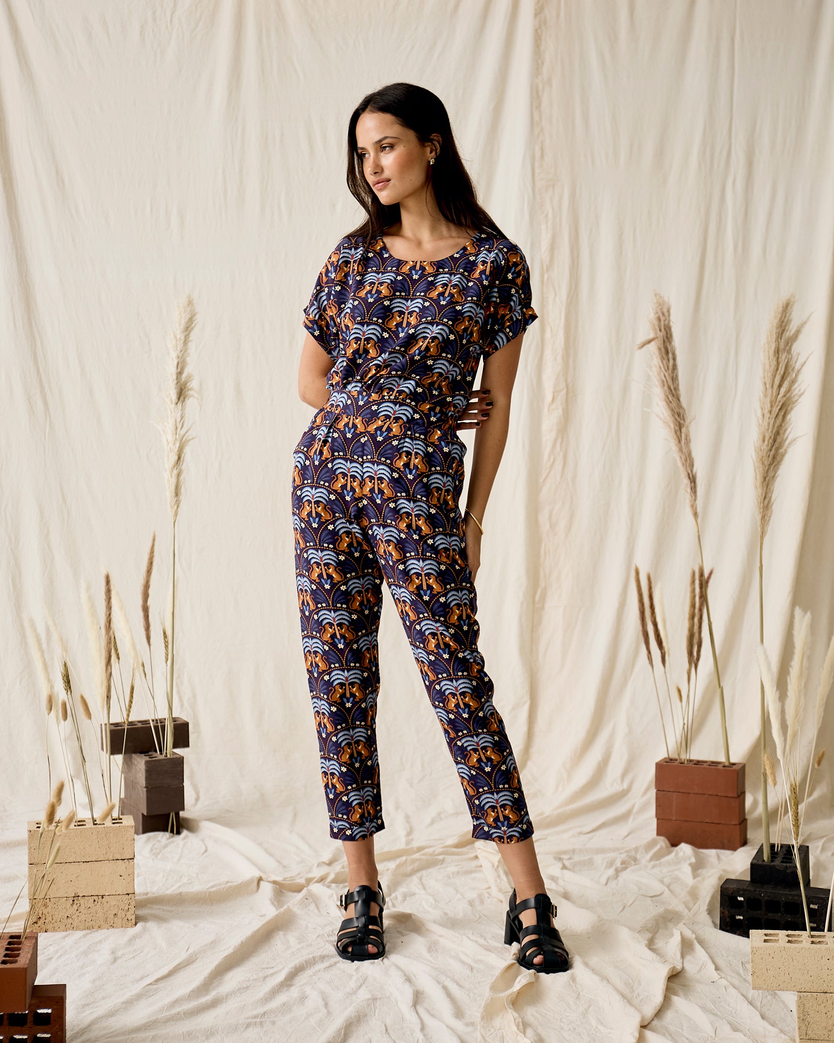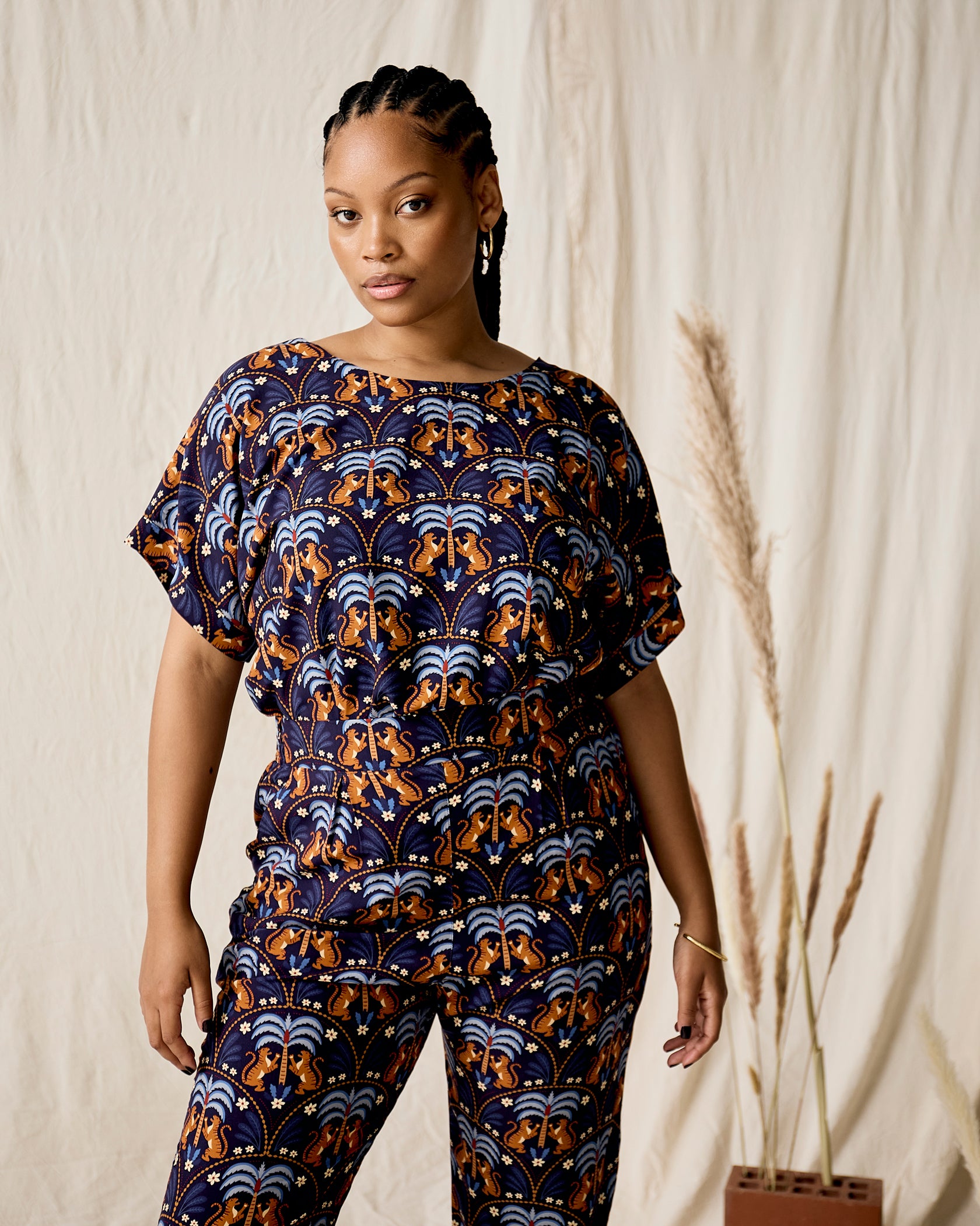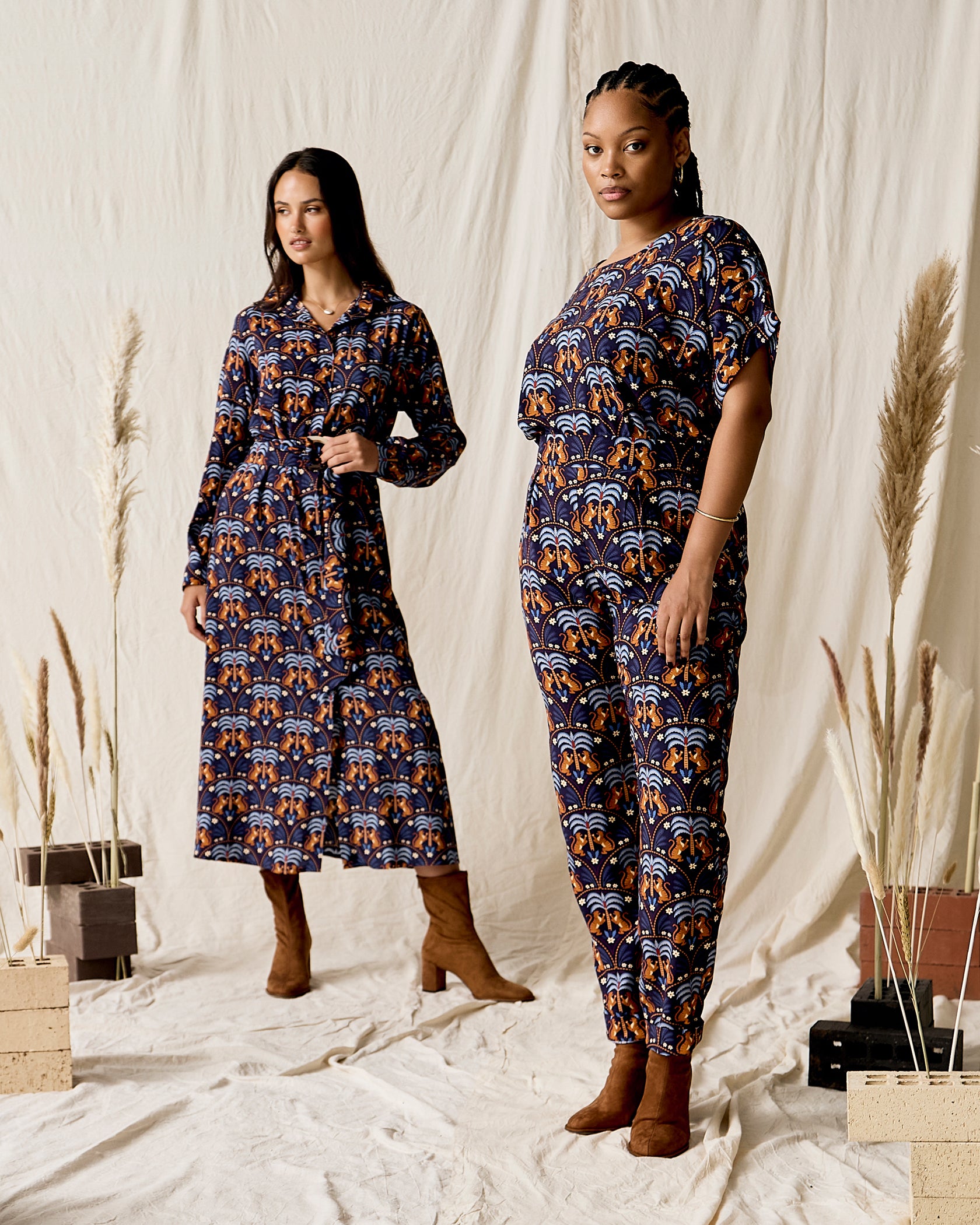 Handmade in Cape Town. Natural fibres should preferably be treated as delicates. Dry clean or hand wash in cold water with minimal detergent. Do not twist/wring. Do not tumble dry. Do not dry in the sun. A hot iron on the reverse side of your prints is the answer to restoring your Rayon/natural fibre to its former shape and silkiness.
