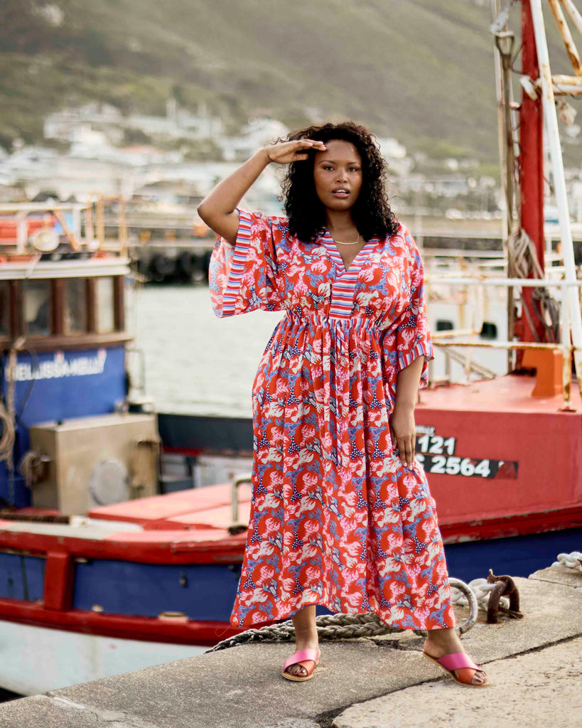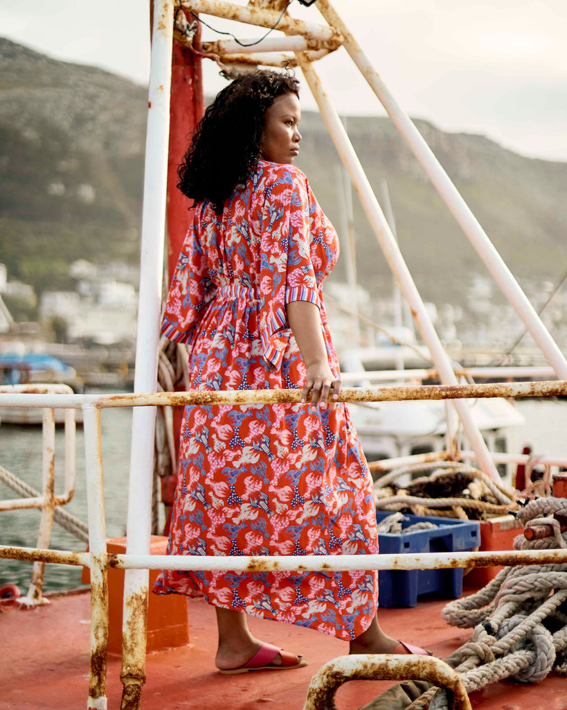 Handmade in Cape Town. Natural fibres should preferably be treated as delicates. Dry clean or handwash in cold water with minimal detergent. Do not twist/wring. Do not tumble dry. Do not dry in the sun. A hot iron on the reverse side of your prints is the answer to restoring your Rayon/natural fibre to its former shape and silkiness.