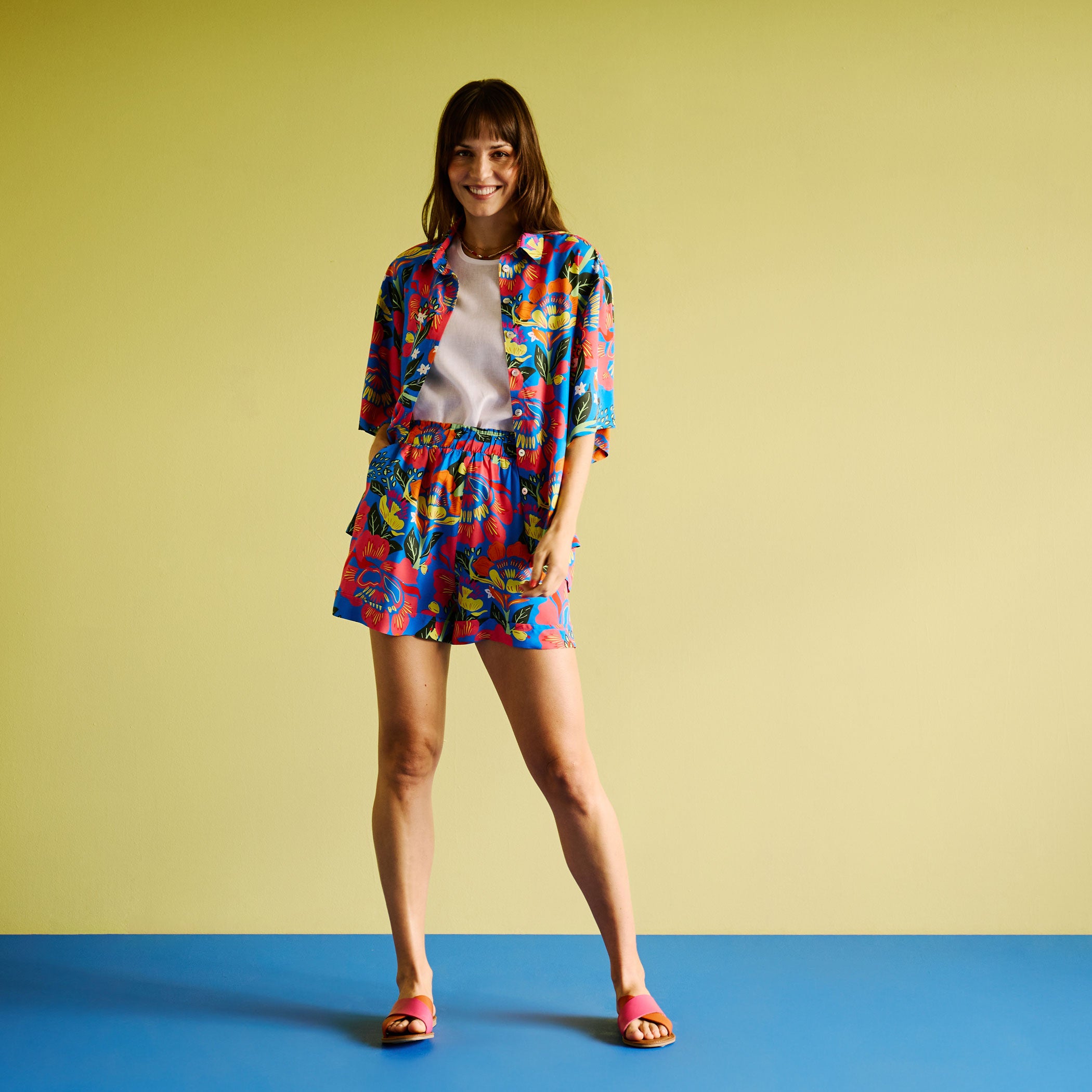 Handmade in Cape Town. Natural fibres should preferably be treated as delicates. Dry clean or hand wash in cold water with minimal detergent. Do not twist/wring. Do not tumble dry. Do not dry in the sun. A hot iron on the reverse side of your prints is the answer to restoring your Rayon/natural fibre to its former shape and silkiness.