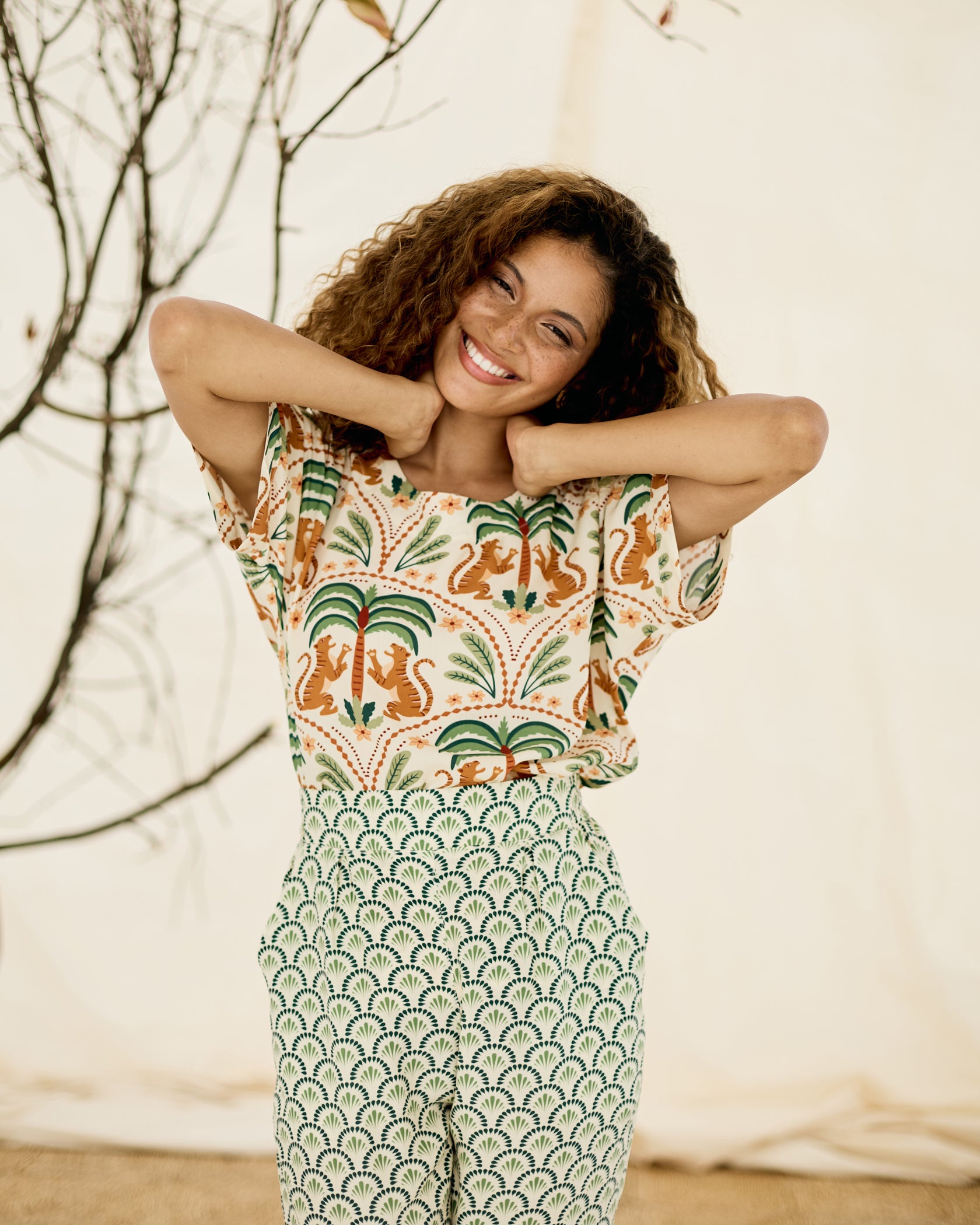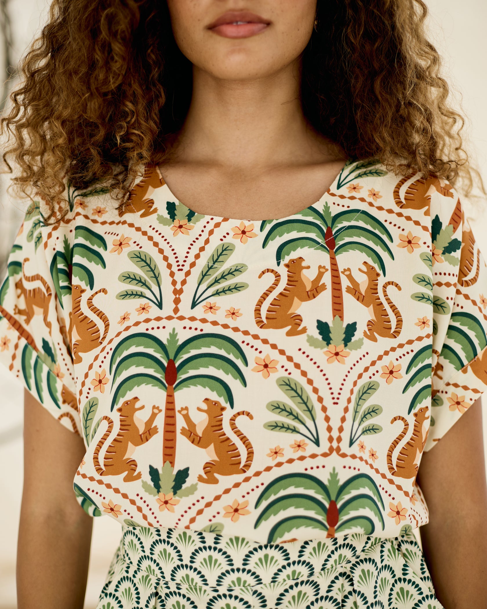 Handmade in Cape Town. Natural fibres should preferably be treated as delicates. Dry clean or hand wash in cold water with minimal detergent. Do not twist/wring. Do not tumble dry. Do not dry in the sun. A hot iron on the reverse side of your prints is the answer to restoring your Rayon/natural fibre to its former shape and silkiness.