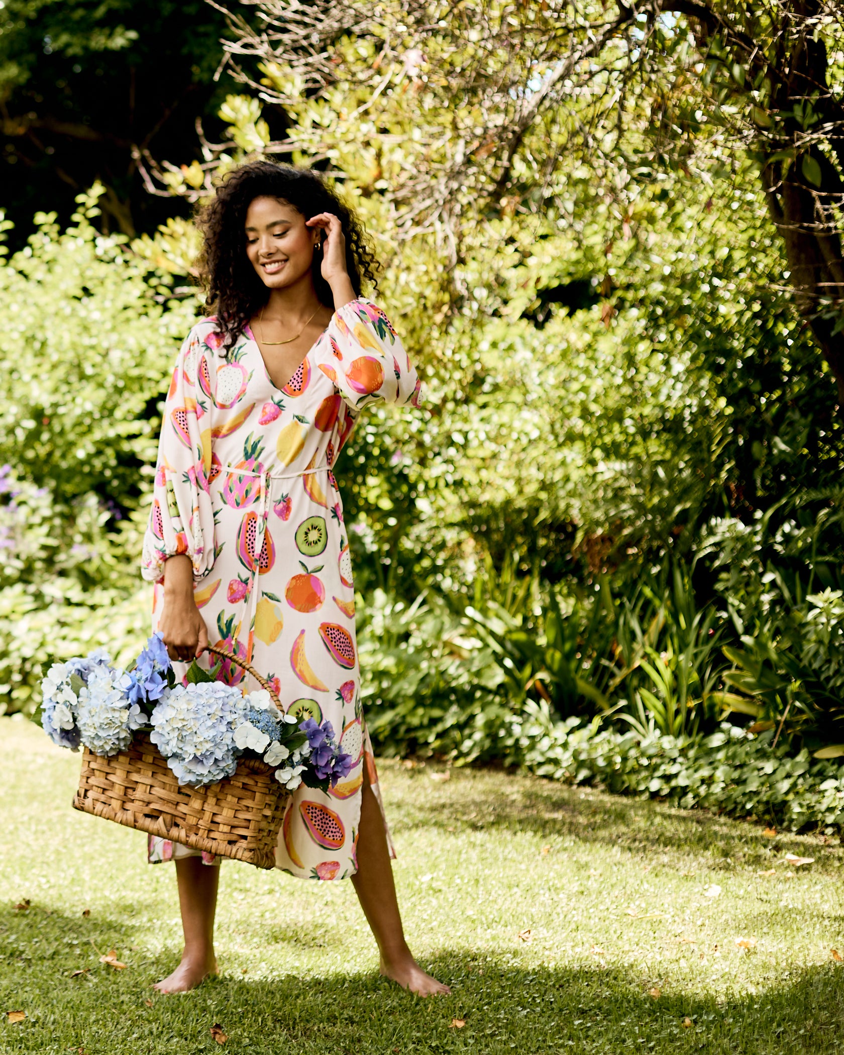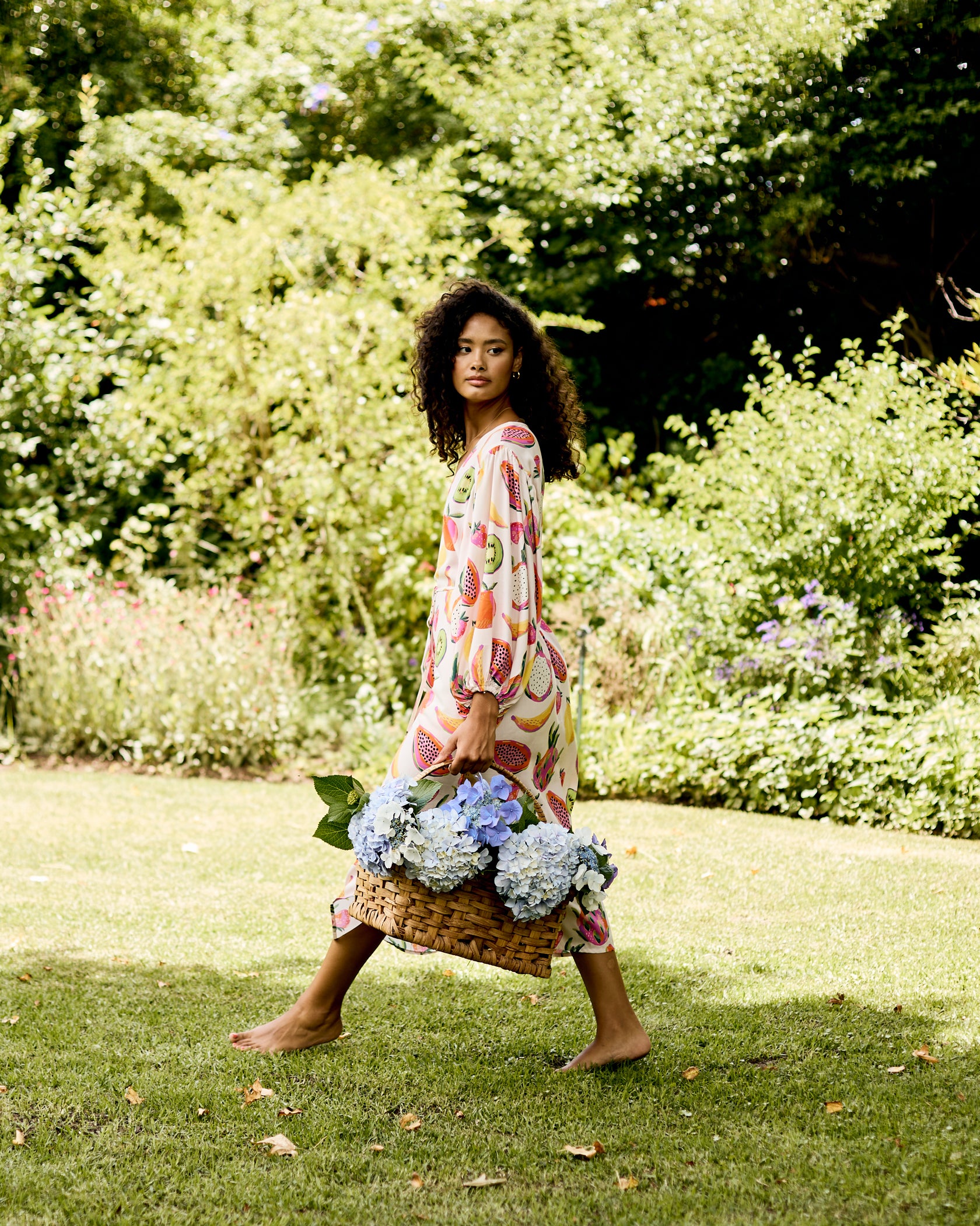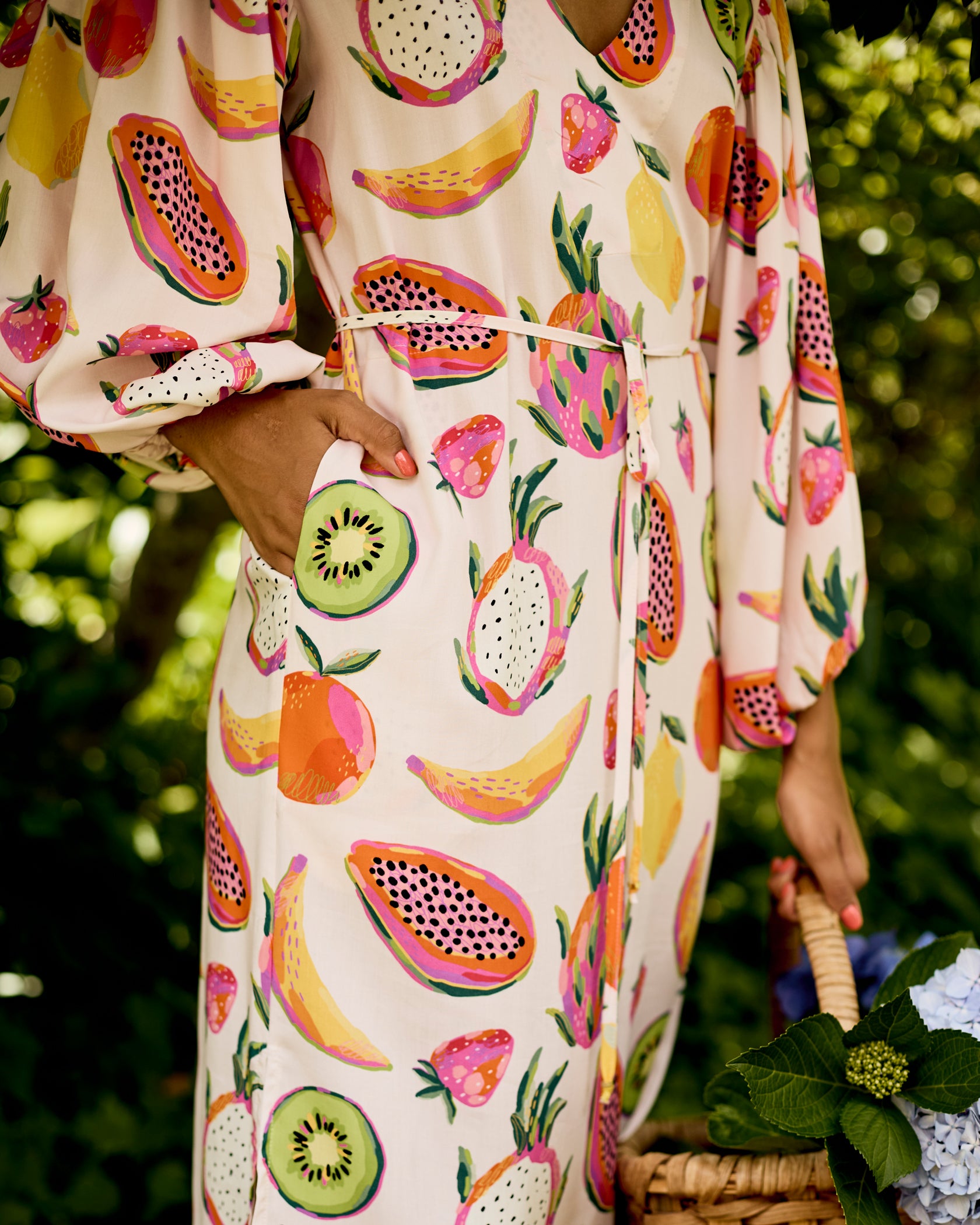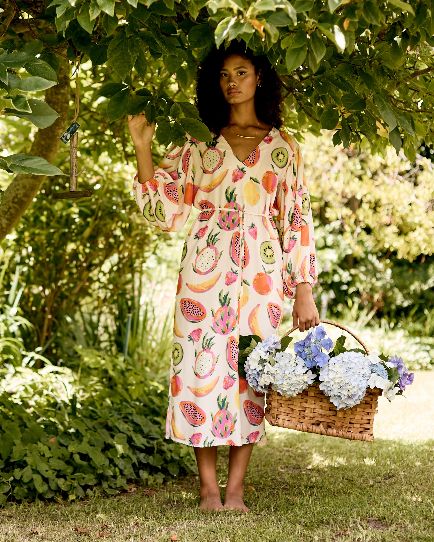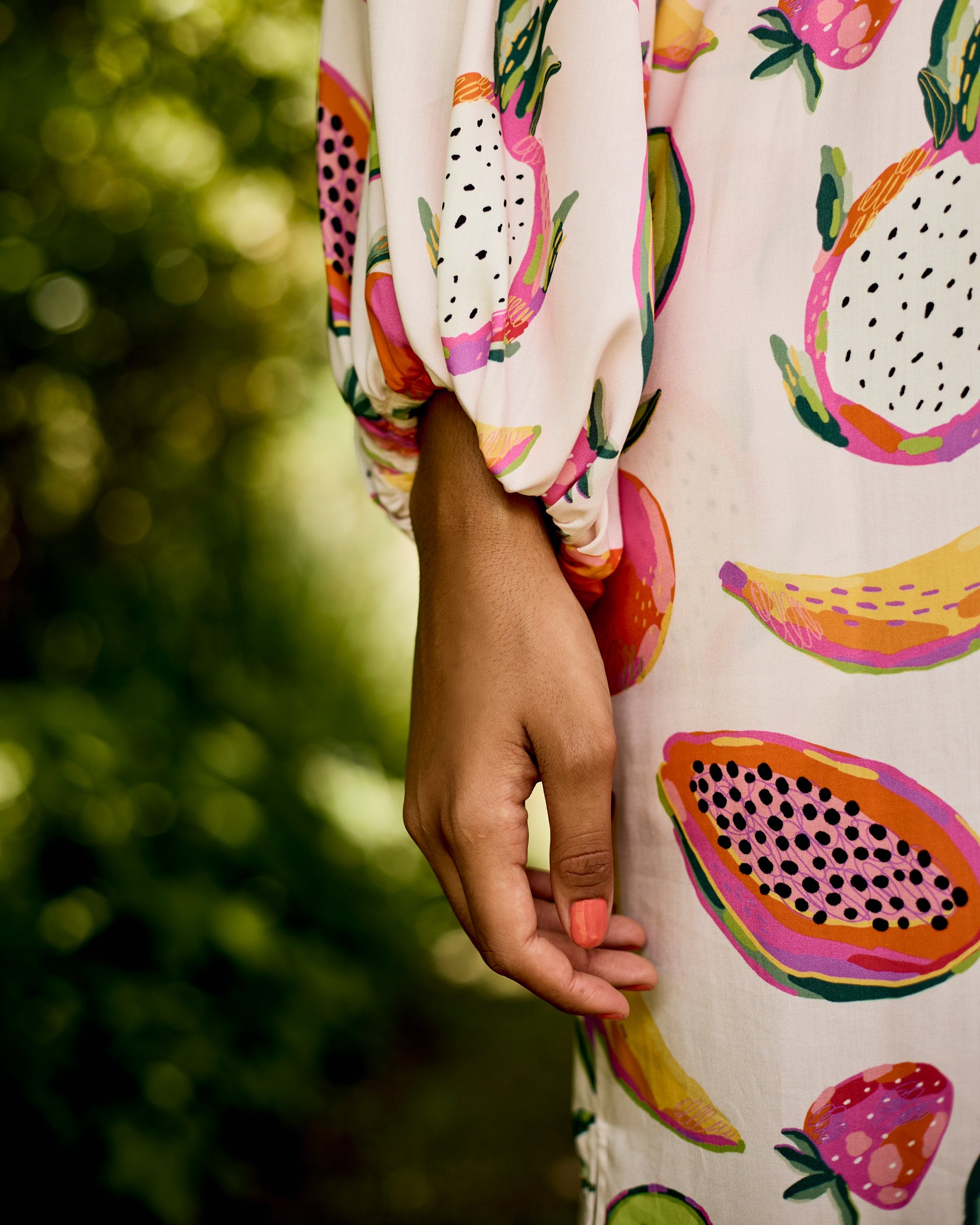 Handmade in Cape Town. Natural fibres should preferably be treated as delicates. Dry clean or hand wash in cold water with minimal detergent. Do not twist/wring. Do not tumble dry. Do not dry in the sun. A hot iron on the reverse side of your prints is the answer to restoring your Rayon/natural fibre to its former shape and silkiness.