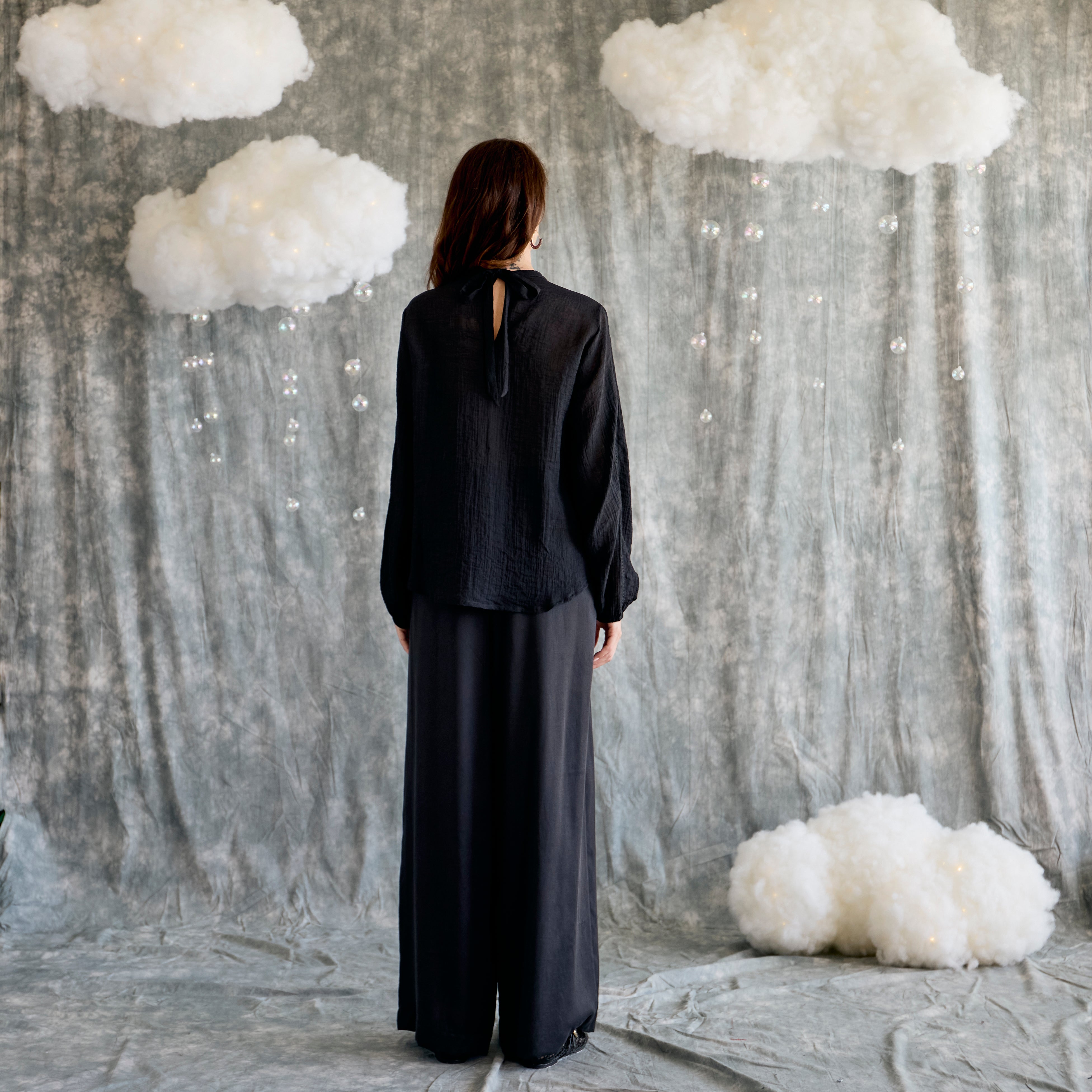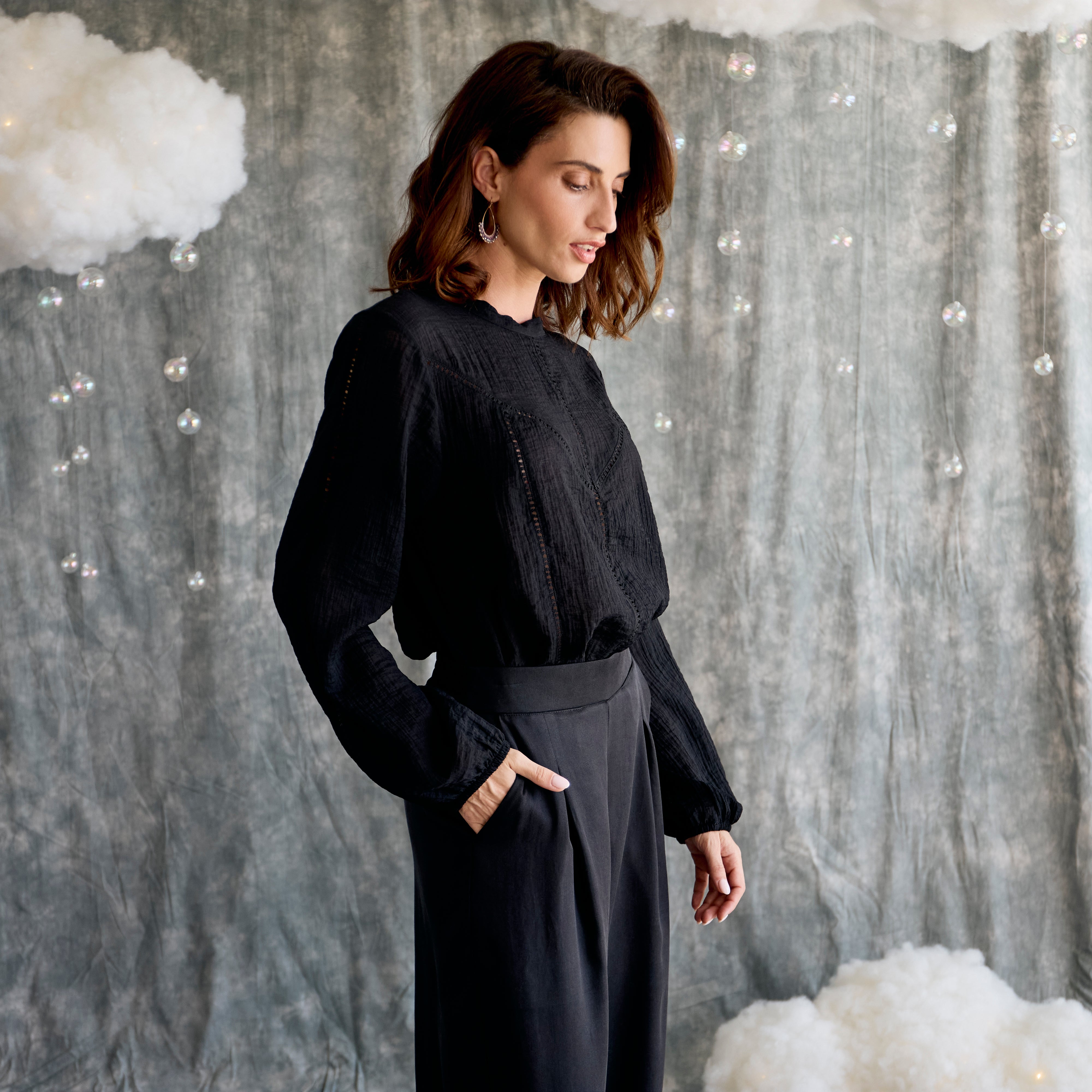 Soft detail, quiet confidence. This blouse keeps things easy with a round neckline that ties neatly at the back, while delicate pintucks and ladder lace trace gentle shape across the front. Long sleeves with softly elasticated cuffs bring a relaxed elegance, and a waterfall frill hem adds just the right amount of movement.