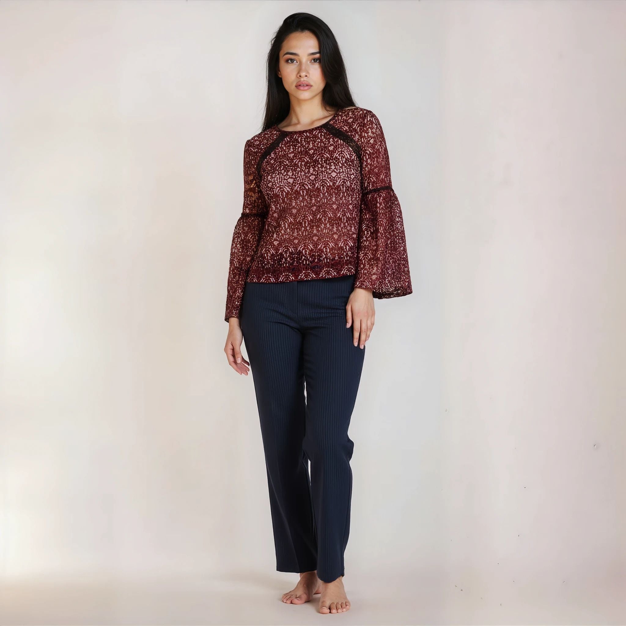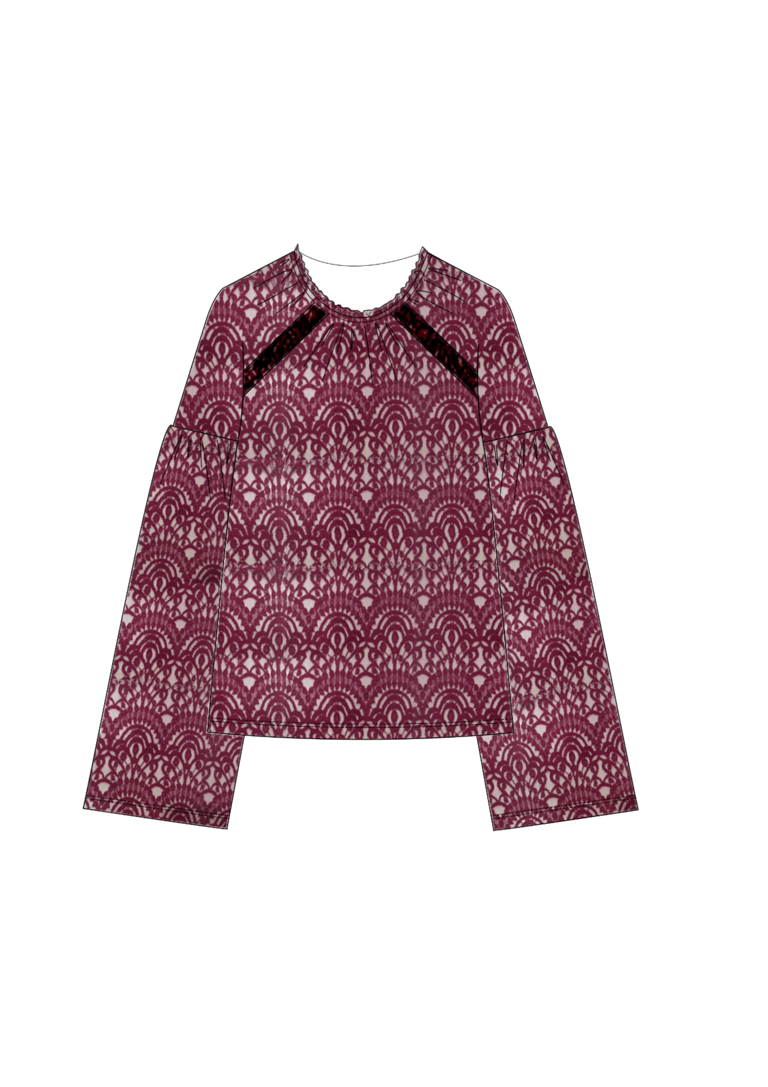 A romantic take on everyday lace. This raglan sleeve top features a soft frill neck finish, a cutline above the elbow with gentle gathers, and long bell sleeves that bring subtle drama to the silhouette. Lightweight, detailed, and beautifully airy, a new season lace moment.
