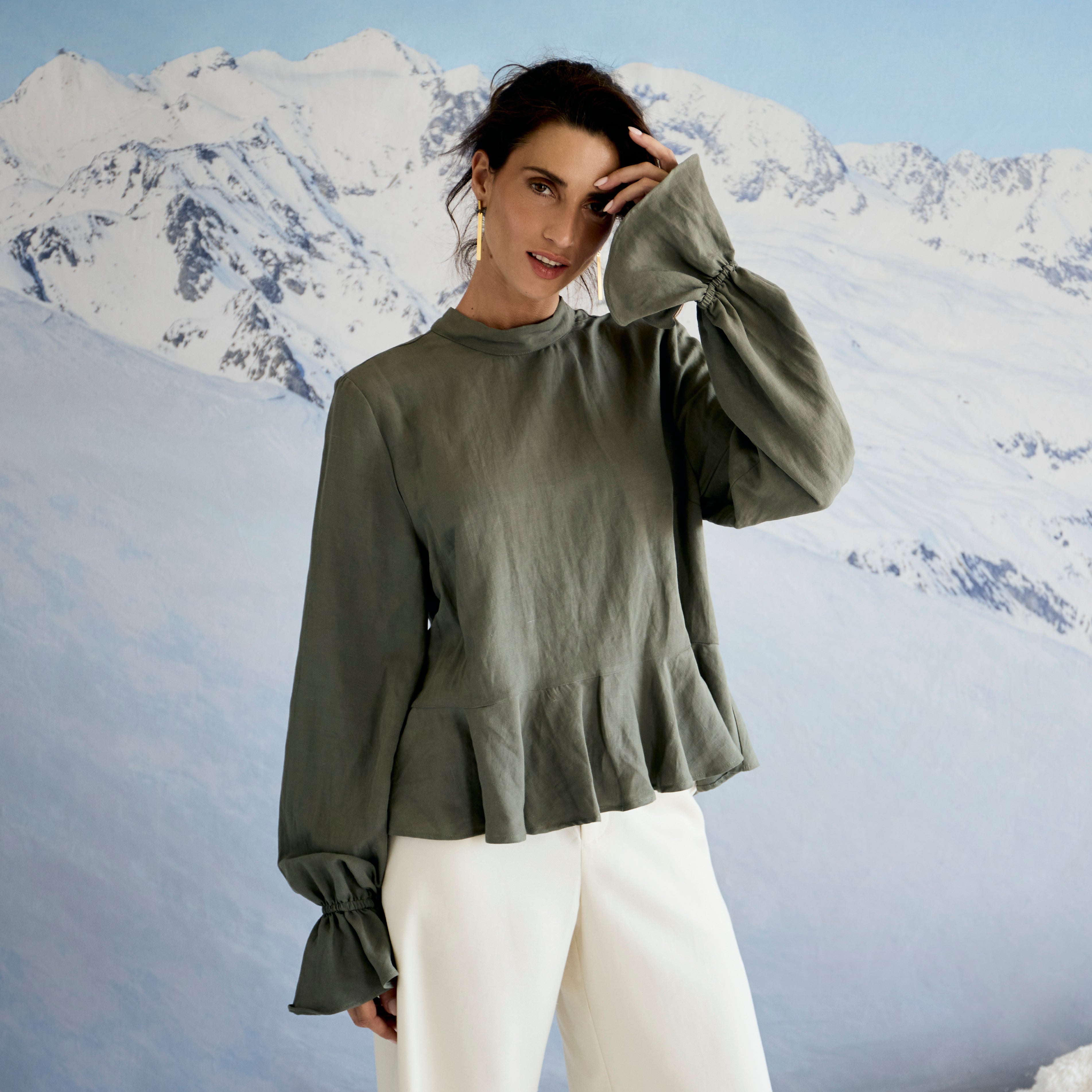 The Peplum Top steps into the spotlight with a crisp round neck, soft back tie detailing and a full circle frill that sits beautifully flat along the waist. Extra-long sleeves steal the scene with elasticated cuffs and an asymmetric frill at the wrist. A little swish, a little flourish, all GOOD charm.