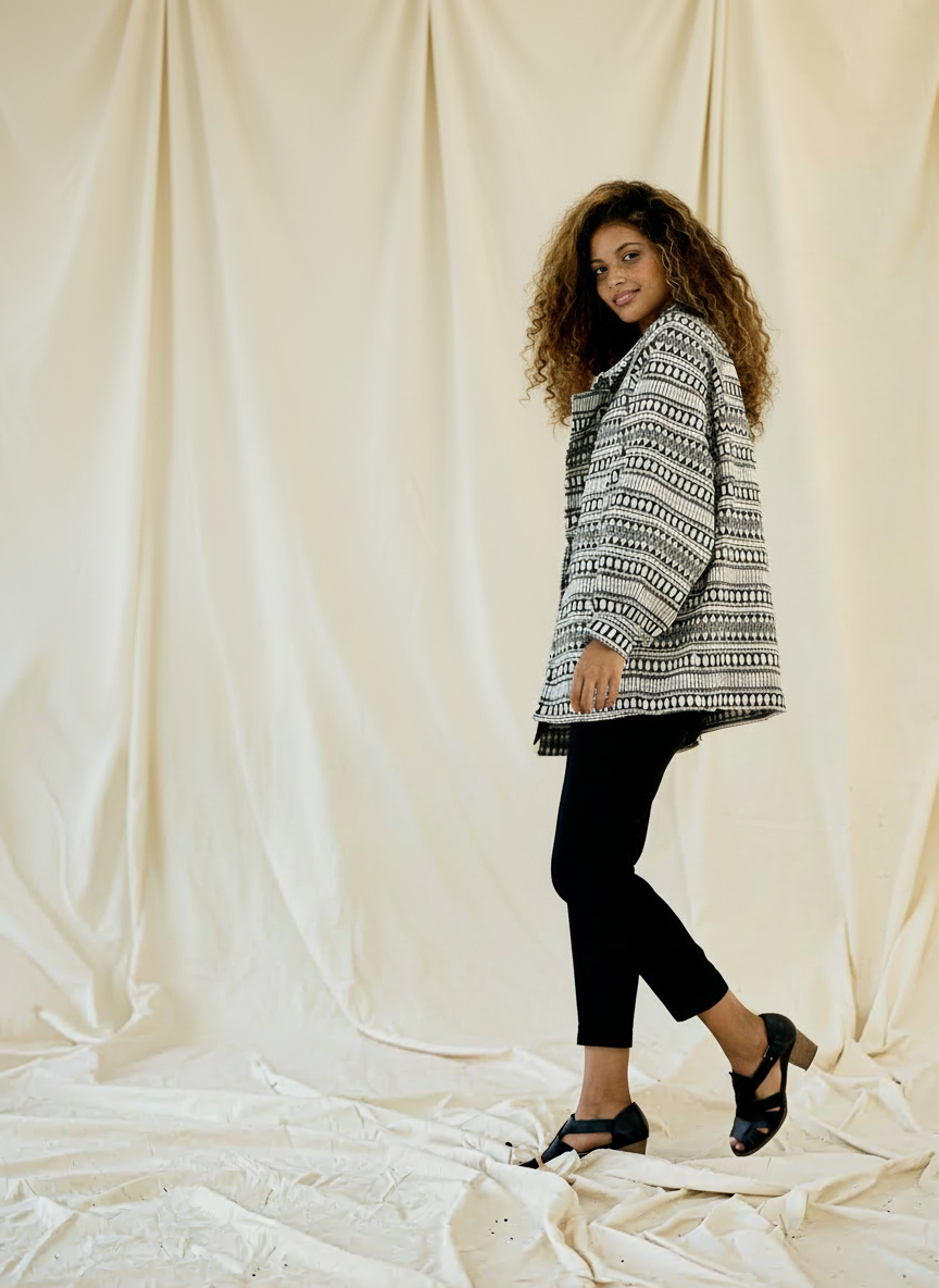 Please Note: This fabric is hand woven in India- there will be slight irregularities and organic slubs in the weave (see last picture) and the threads. As with any weave- there is a higher risk of snagging so please take extra care when wearing this jacket.