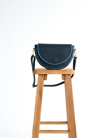 Classic, cool, and quietly playful. The Navy Piped Indaba Clutch pairs a deep, inky base with sky-blue piping for a fresh hit of contrast. With a soft half-moon silhouette and an adjustable strap, it is polished but relaxed. The kind of piece that elevates an everyday look.