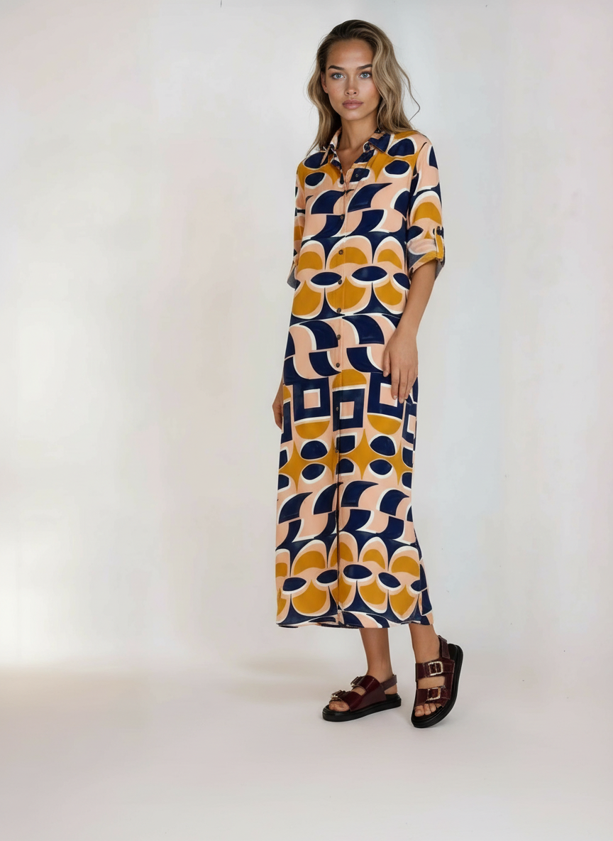 A mood boosting shirt dress with an easy swing and a graphic, retro edge. The relaxed button down silhouette keeps things effortlessly polished, while twin needle stitching adds that quiet, crafted finish. Rolled sleeves, a soft drape, and a just right midi length make it an everyday statement, equal parts playful and refined, designed to brighten the season in one smooth move.